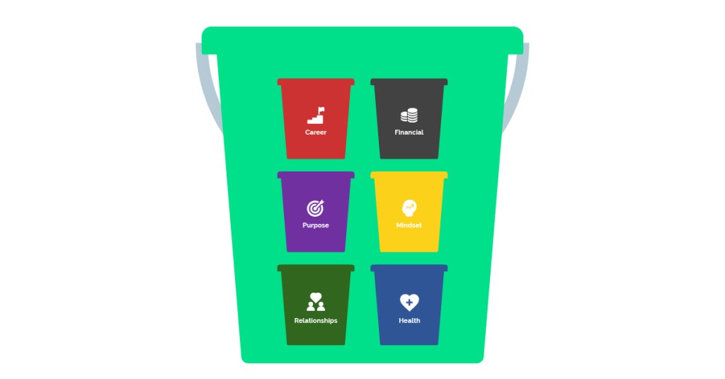 Imagine your life is all held in this pail…the fuller the pail the more topped up and happy you feel. Then imagine that each of the six mini pails all contribute to the fulfilment and happiness you feel in life. If one or two of these pails isn’t being filled up that is manageable. However, if more than three of the pails are feeling empty this will likely have a significant impact.